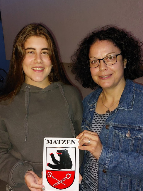 Zu Schulschluss und zum Abschied der beiden ließ sich Konny Hofer etwas ganz Besonderes einfallen: Sie schenkte Isabella und Giovanni das Matzner Wappen aus dem Archiv, zur Erinnerung an dieses besondere Schuljahr und ihren Aufenthalt in Matzen.